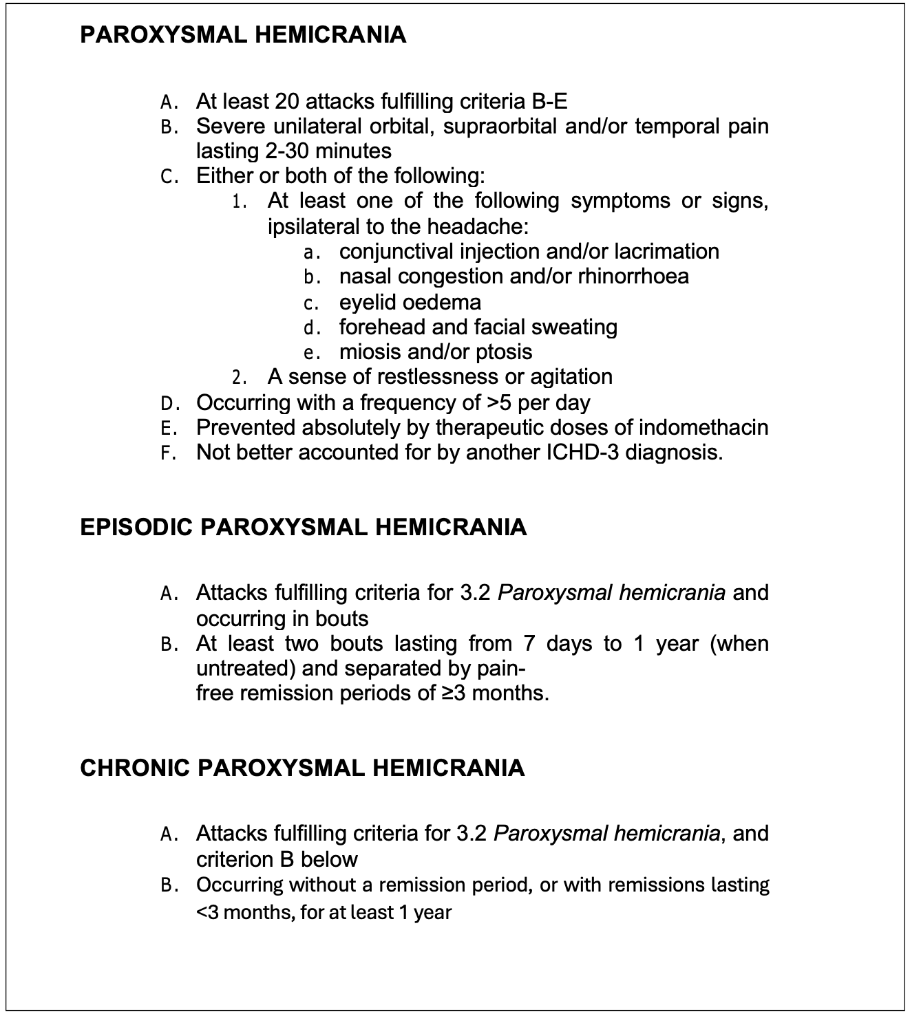 The attacks are shorter and more frequent than in cluster headaches and longer and less frequent than in SUNCT/SUNA. The typical circadian characteristics seen in cluster headache are less prominent in paroxysmal hemicrania. All attacks are spontaneous unlike SUNCT/SUNA, in which attacks are often triggered immediately by various sensory stimuli. The key distinction is the clear therapeutic response to Indomethacin. The main differential diagnoses are shown are shown as an appendix.