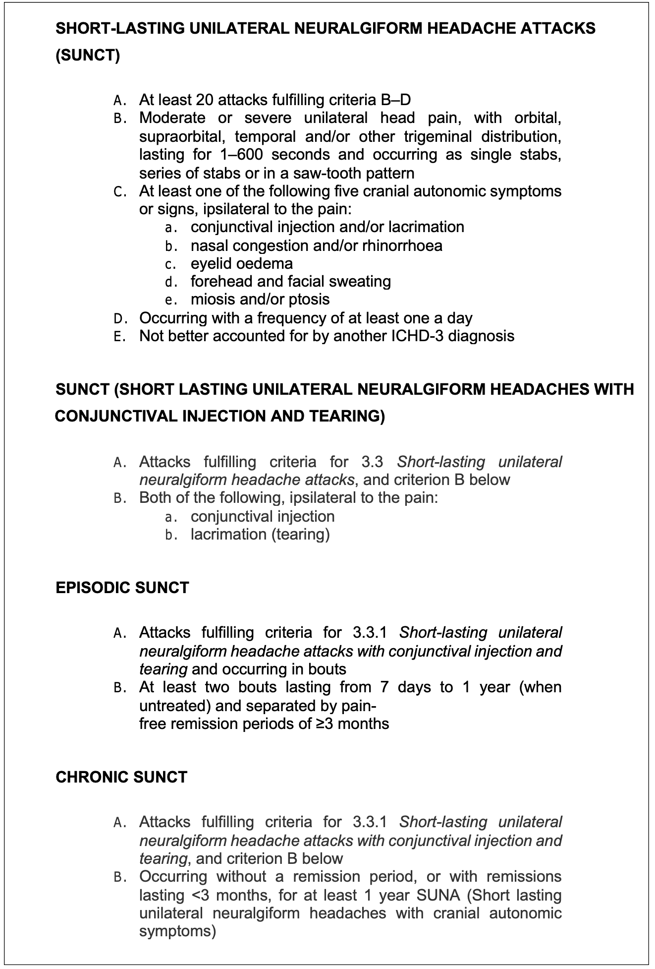 The original description of this disorder was termed SUNCT, short-lasting unilateral neuralgiform attacks with conjunctival injection and tearing (Sjaastad et al., 1989).
