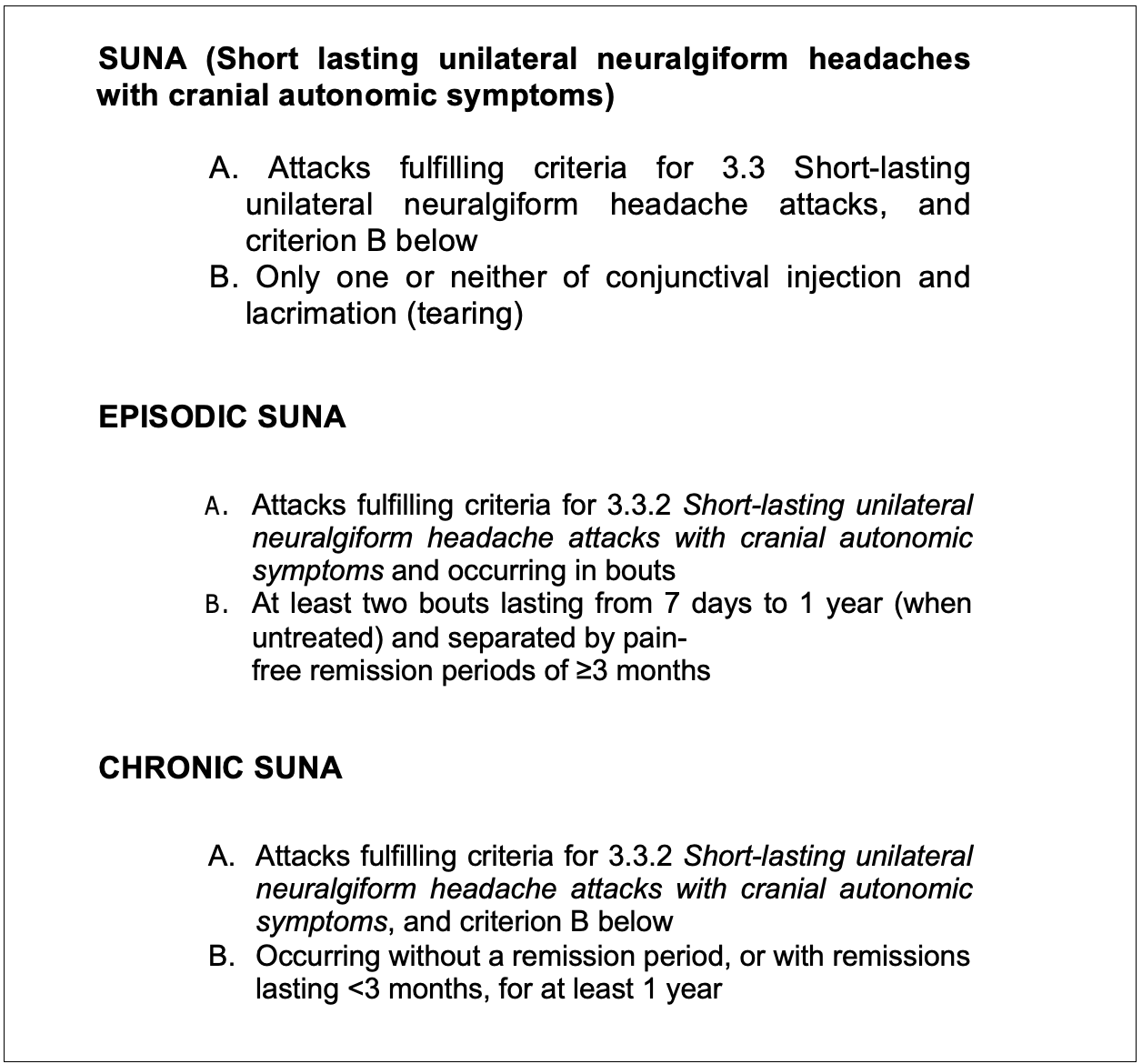 The terminology SUNA was proposed based on the fact that a number of patients were noted to lack one or both of these symptoms (Williams & Broadley, 2008) (Weng et al., 2017). The distinction remains within the ICHD classification. From a clinical perspective, management remains the same.